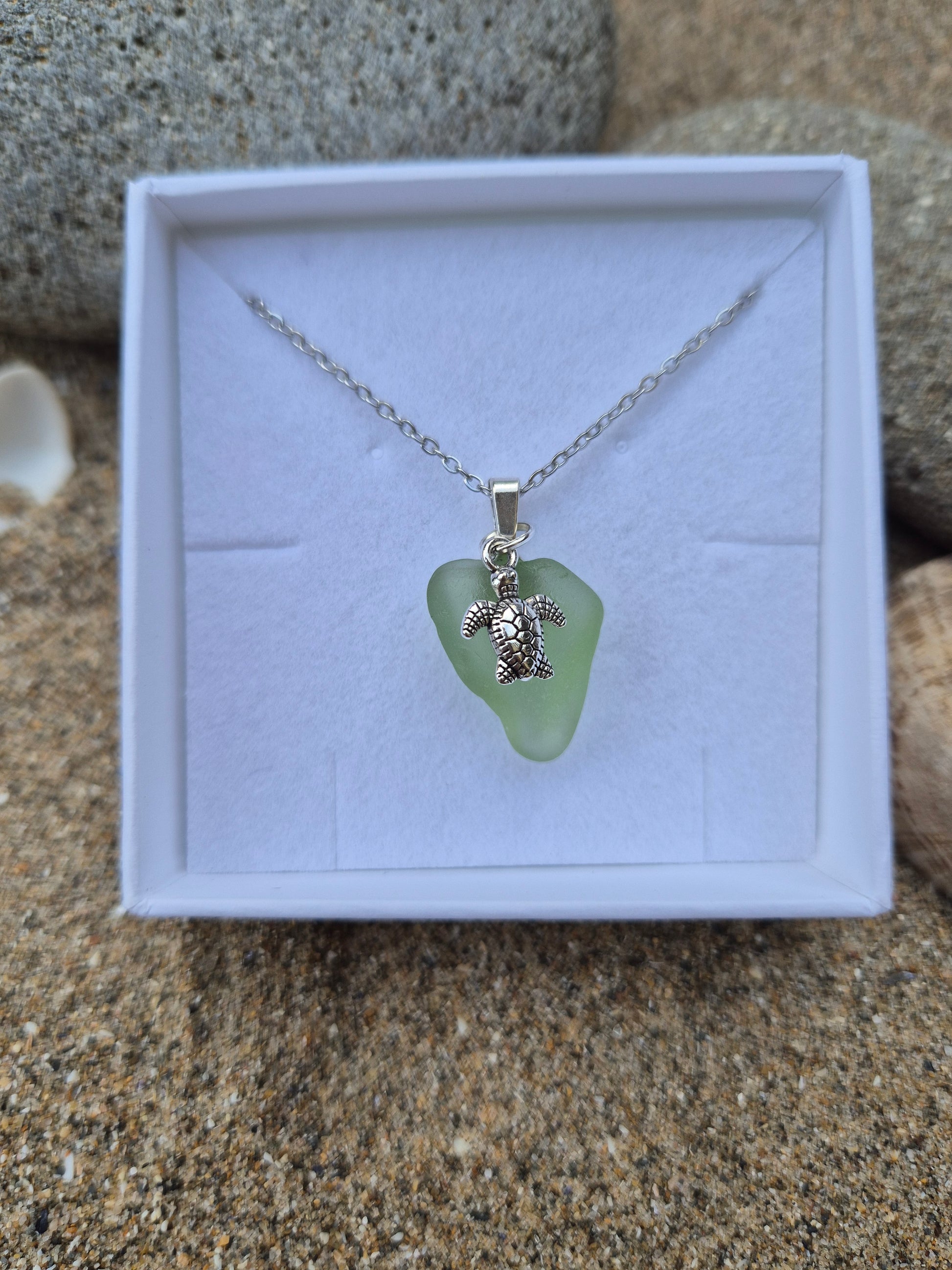 Seafoam Green Sea Glass Necklace with Turtle Charm – Handmade Welsh Coastal Jewellery